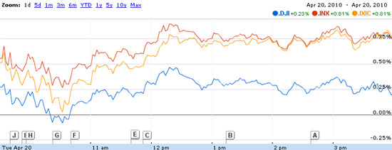 Điểm qua kết quả giao dịch ngày 20/4: chỉ số Dow Jones tăng 25,01 điểm, tương đương 0,23%, chốt ở mức 11.117,06. Chỉ số Nasdaq lên 20,2 điểm, tương ứng 0,81%, chốt ở mức 2.500,31. Chỉ số S&P 500 tiến thêm 9,65 điểm, tương đương 0,81%, chốt ở mức 1.207,17.